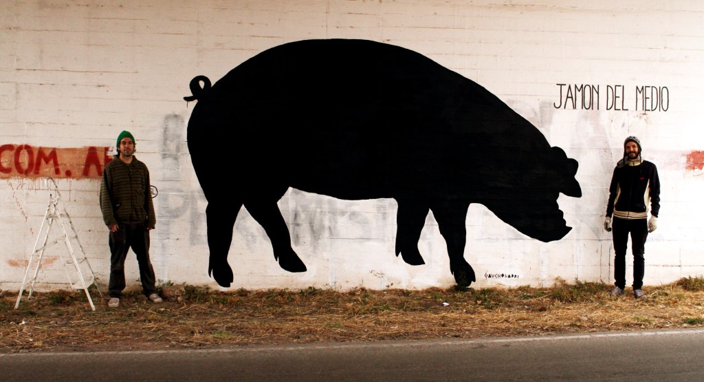 En 2010 formamos, junto con un amigo diseñador, Marcos Zerene, un colectivo de arte urbano llamado Gaucholadri, que estaba despojado de nuestros estilos artísticos personales y más ligado a nuestros recursos de diseñadores gráficos. Creamos un proyecto llamado Iconografía Tercermundista, que consistía en pintar íconos en blanco y negro (una silueta negra con una frase), a veces con un mensaje de crítica social, otras veces jugando con elementos de la cultura local argentina, o simplemente algo que nos parecía divertido o irónico. Nuestra idea era sacar a la gente de la monotonía de la calle, hacerlos pensar, reír, reflexionar, nuestras intervenciones dejaban libre a la imaginación del espectador la interpretación del significado. Este proyecto tuvo buena repercusión, lo cual nos llevó a irnos de gira por Europa. En 2014 ganamos un concurso para participar en un importante festival de arte urbano que se hacía en Ibiza -el Bloop Festival- así que aprovechamos el viaje para girar y pintar por distintas ciudades como Madrid, Barcelona, Roma, Florencia, Berlín, Ámsterdam. Nos sorprendió lo bien que recibieron nuestra propuesta artística a pesar de ser algo tan relacionado a la cultura local argentina. Ahí comprendí el poder del arte para conectar, para viajar y abrir fronteras, conocer gente, distintas culturas, desde adentro, desde sus calles. A pesar de las diferencias culturales, el arte tiene el poder de unir, rompe nuestras barreras humanas y nos conecta como seres a través del espíritu.