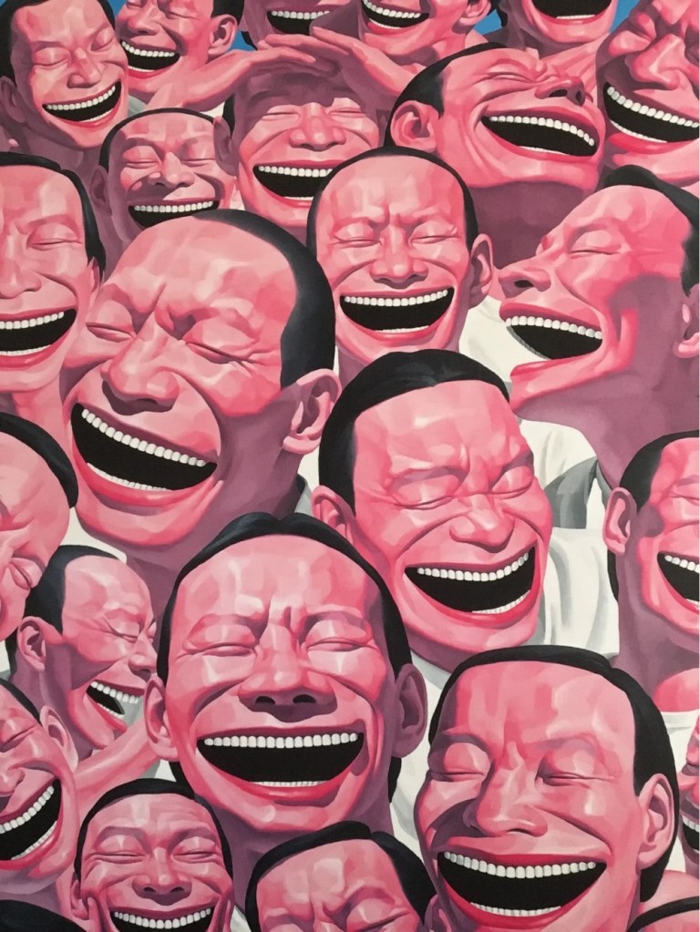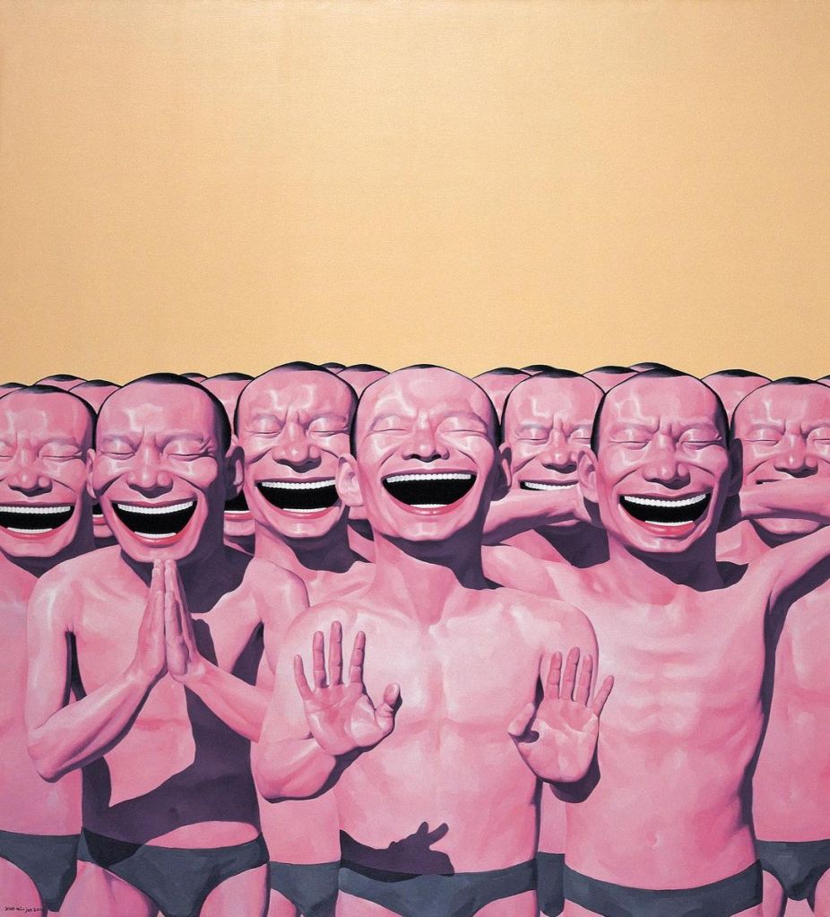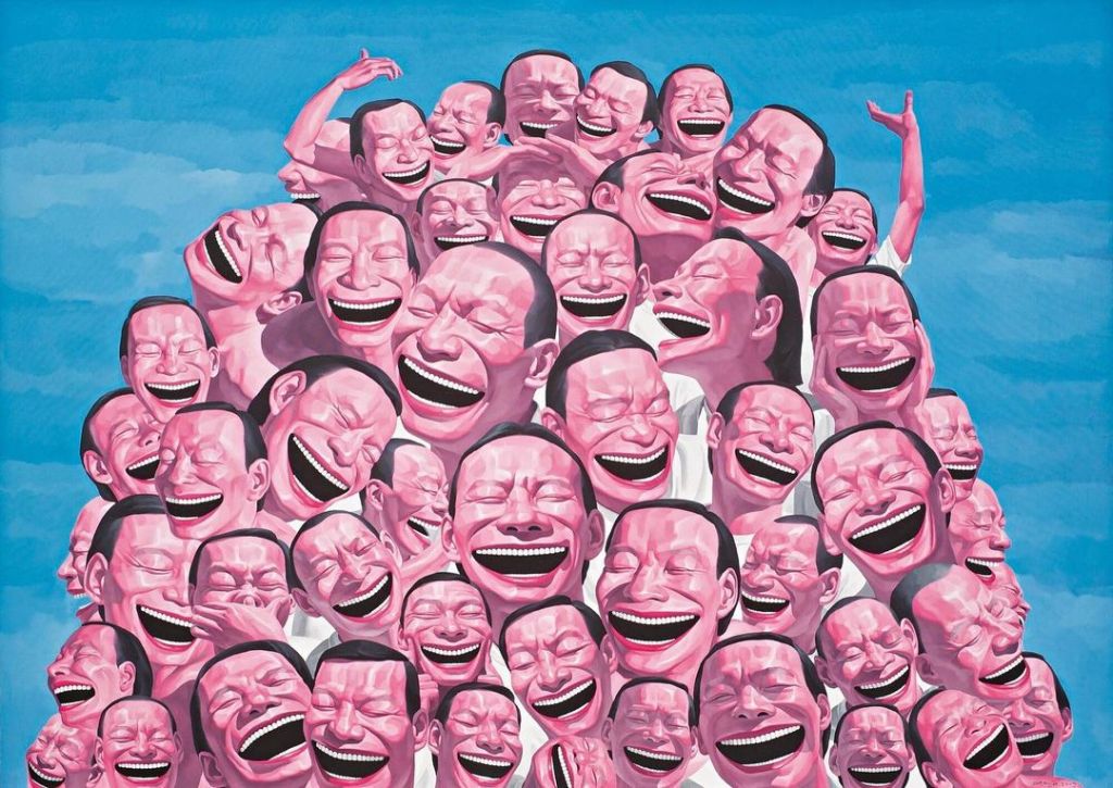 Por otro lado, la fama de Minjun en el mercado de “Occidente” -vendiendo incluso algunas de sus obras por cifras extravagantes, como ocurrió en 2007 con “La ejecución” (1995) en el Sotheby’s londinense- no parece ser casual, quizás debido al interés geopolítico de contrapropaganda hacia China por parte de potencias extranjeras, pero también a las resonancias que su trabajo tiene -en tanto que crítica, intencional o no- con la visión occidental de la idea de felicidad. Y es que, bajo el modelo hegemónico anglosajón, ese ideal apunta, más que a la felicidad del grupo, a la del individuo. Una sociedad atomizada que busca mantener el “estado de risa” (de felicidad) a través del consumo, nutriéndose de miles de libros de autoayuda y de gurús del mindfulness, para luego caer en el exhibicionismo impostado de una “vida feliz” o en el narcisismo exacerbado de las selfies -de las máscaras- en las redes sociales. Es en tiempos del abuso mímico de la risa -basta ver al pasar los carteles de candidatos políticos- como gesto positivo, tranquilizador (que demuestre que se ha apartado del intelecto el error: cualquier rastro de negatividad o desconfianza hacia el prójimo), que no importa qué acontezca ni cuál sea el “nivel de dolor” a tolerar, todo lo que podemos hacer, en irónica e impotente escenificación de pose barthesiana, es reír: “Aquí estamos amontonados en un gran montón de basura formando una colina abyecta y, sin embargo, somos felices y nos reímos”.6