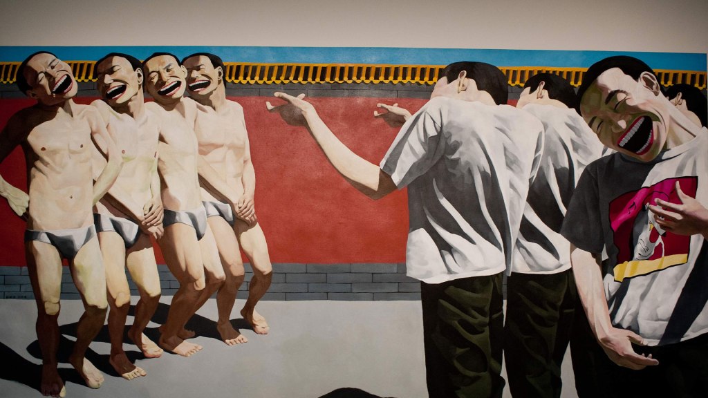 Lo ridículo, o más bien su consecuencia natural, la risa, atraviesa toda la obra de Yue Minjun. Este artista contemporáneo -dibujante, pintor, grabador y escultor-, nacido en 1962 al noreste de la República Popular China (hoy residente en Beijing), es reconocido internacionalmente desde la década de los ‘90 por sus pinturas de personajes grotescos que ríen a carcajadas en escenas absurdas o imitando obras de arte famosas3. Esto, que aparentaría ser un mero capricho temático o estilístico, cobra plena significación apenas lo contrastamos con su contexto biográfico. Entre los sucesos históricos que afectaron al pintor, los de 1989 dejaron en él una marca particular: la represión por parte del ejército chino contra estudiantes y trabajadores en la llamada Masacre de Tiananmen. Minjun tampoco pudo escapar de la influencia estilística que había dejado la propaganda visual del régimen maoísta. Esos carteles propagandísticos con los que creció administraban la doctrina comunista a las masas: un bombardeo visual de imágenes coloridas, idílicas, edulcoradas con rostros sonrosados mirando el horizonte y sonrisas blancas multiplicándose por doquier.